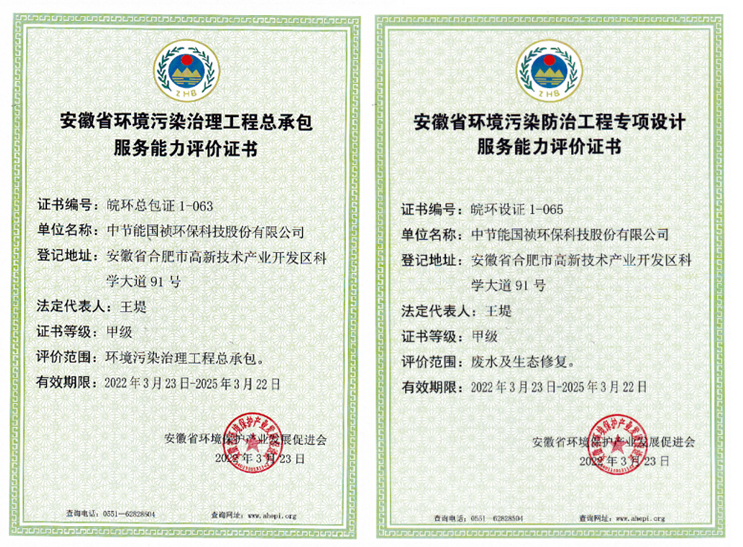 3月23日,經(jīng)過(guò)前期材料準(zhǔn)備、專家評(píng)審及實(shí)地考察,中節(jié)能國(guó)禎獲得安徽省環(huán)境保護(hù)產(chǎn)業(yè)發(fā)展促進(jìn)會(huì)頒發(fā)的《安徽省環(huán)境污染治理工程總承包服務(wù)能力評(píng)價(jià)證書(shū)(環(huán)境污染治理工程總承包甲級(jí))》、《安徽省環(huán)境污染防治工程專項(xiàng)設(shè)計(jì)服務(wù)能力評(píng)價(jià)證書(shū)(廢水及生態(tài)修復(fù)甲級(jí))》兩項(xiàng)證書(shū)。